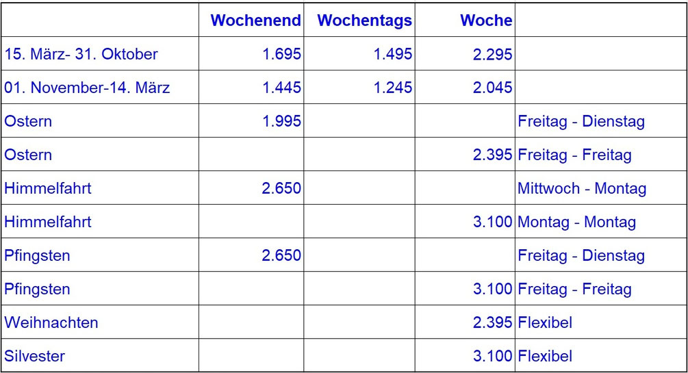 Preise bis 30 Personen - Extra Wohnungen/Personen auf Anfrage